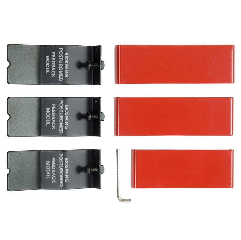 Das Feedbackmodul besteht aus drei roten und drei schwarzen Blechen. Die schwarzen werden an der Schwingfläche auf der Front- und den beiden Außenseiten befestigt. Die roten Gegenstücke werden jeweils unterhalb der schwarzen Bleche direkt am fixen Teil des Posturomed® befestigt. Das schwarze und das rote Blech müssen jeweils so installiert werden, dass sie genau übereinander liegen.