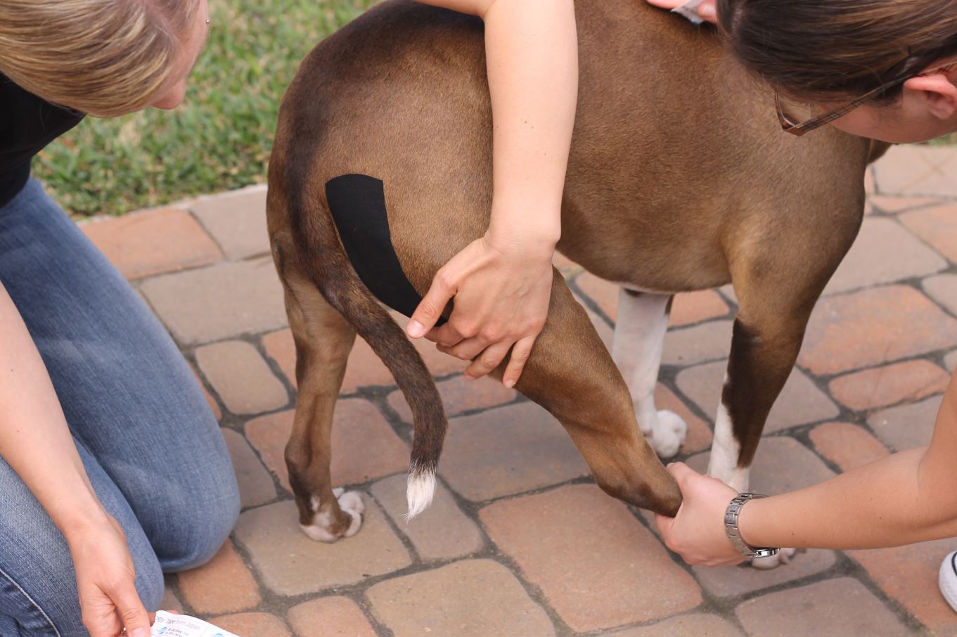 Wenn für die Tape-Anlage gewisse Körperteile vorgedehnt werden müssen, dann ist das mit Tieren nicht ganz so einfach wie mit Menschen. Den menschlichen Patienten weist man einfach an, eine bestimmte Bewegung auszuführen. Bei unseren tierischen Patienten stoßen wir da eher an unsere kommunikativen Grenzen. Daher ist es oftmals sinnvoll, eine dritte Person zur Unterstützung dabei zu haben. Sie kann Gliedmaßen dehnen, während das Tape angeklebt wird, oder dem Tier auch einfach beruhigend zur Seite stehen. Das ist vor allem bei nervösen Patienten von großem Vorteil.