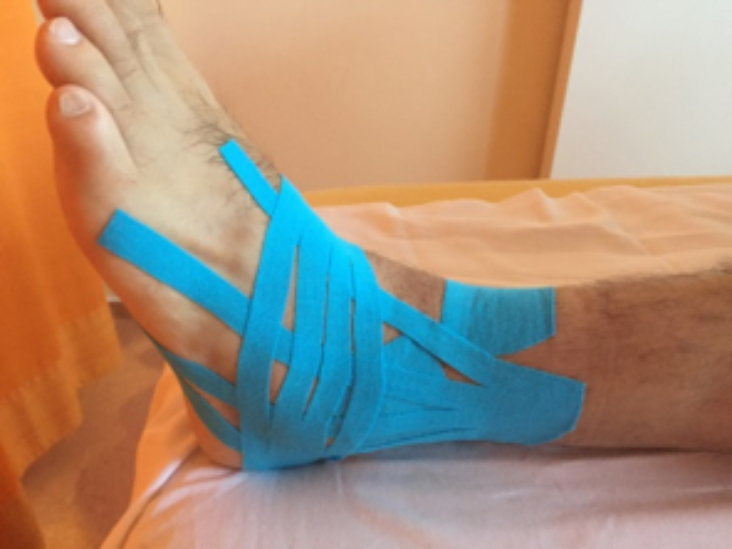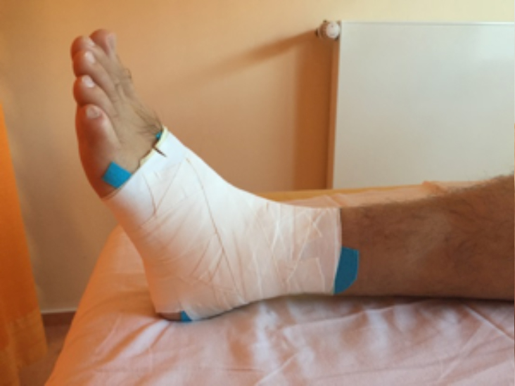 Um eine frühe Belastung zu ermöglichen bzw. einen verstärkten Halt für die Ausheilung zu gewährleisten, wurde für die Verschalung ein Sporttape verwendet. Über eine Unterzugbinde wurde ein klassischer Sprunggelenksverband angelegt und mit einer 8er-Tour (siehe Video) nochmalig verstärkt.