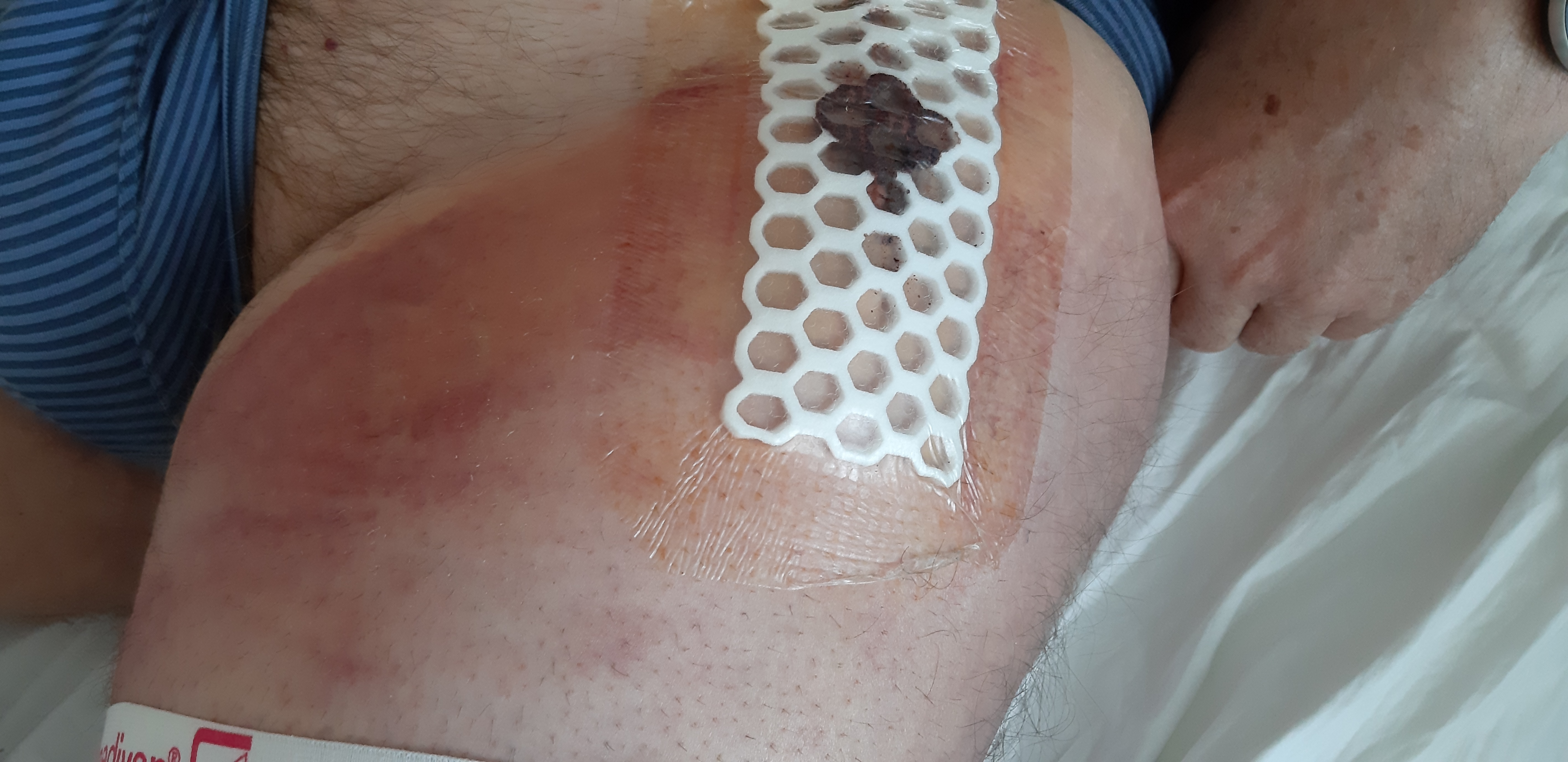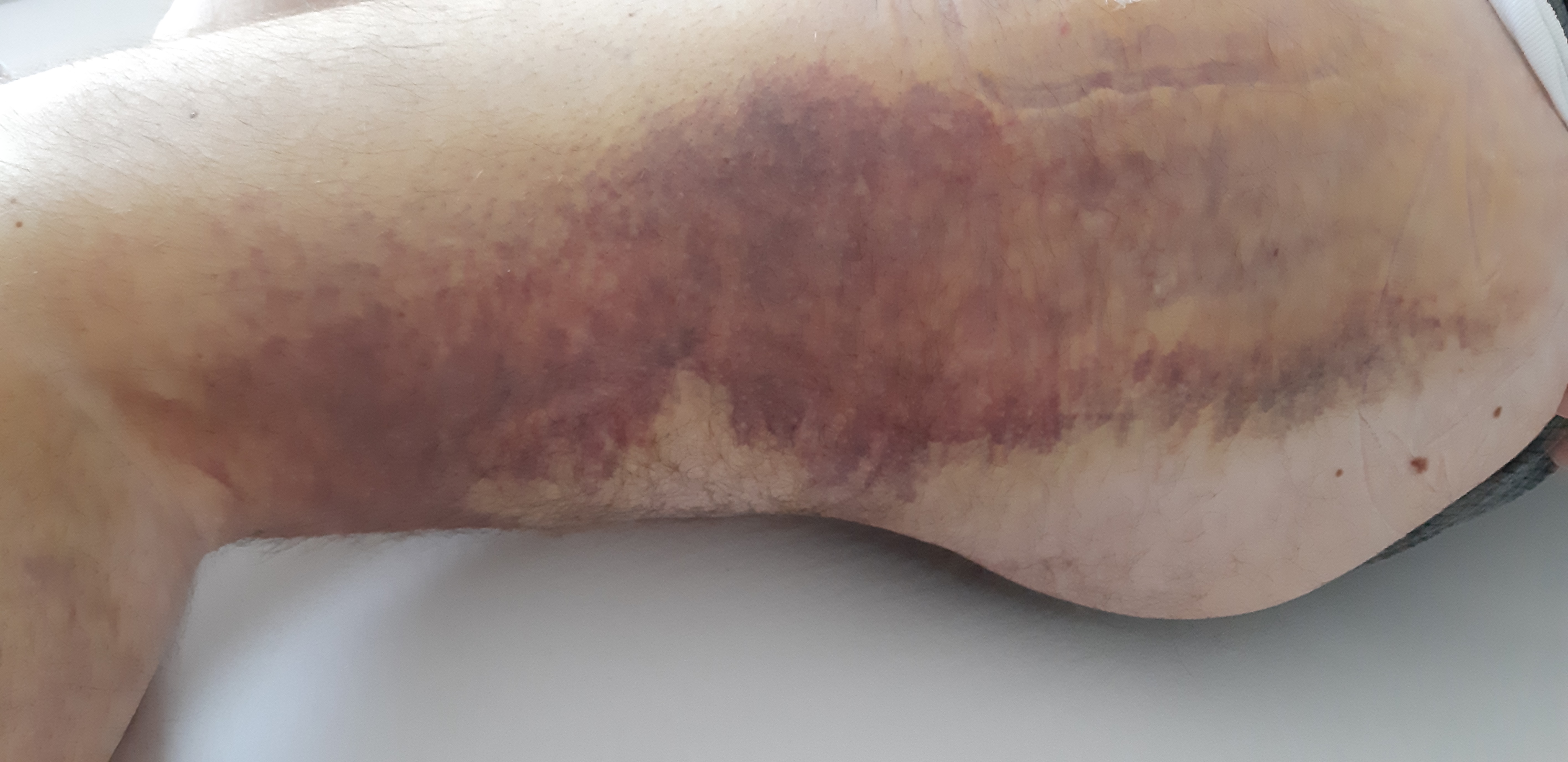 Der Zustand nach der Hüfttotalendoprothese sah wie folgt aus: Hämatom und Schwellung im gesamten Bereich von Hüfte und Oberschenkel.