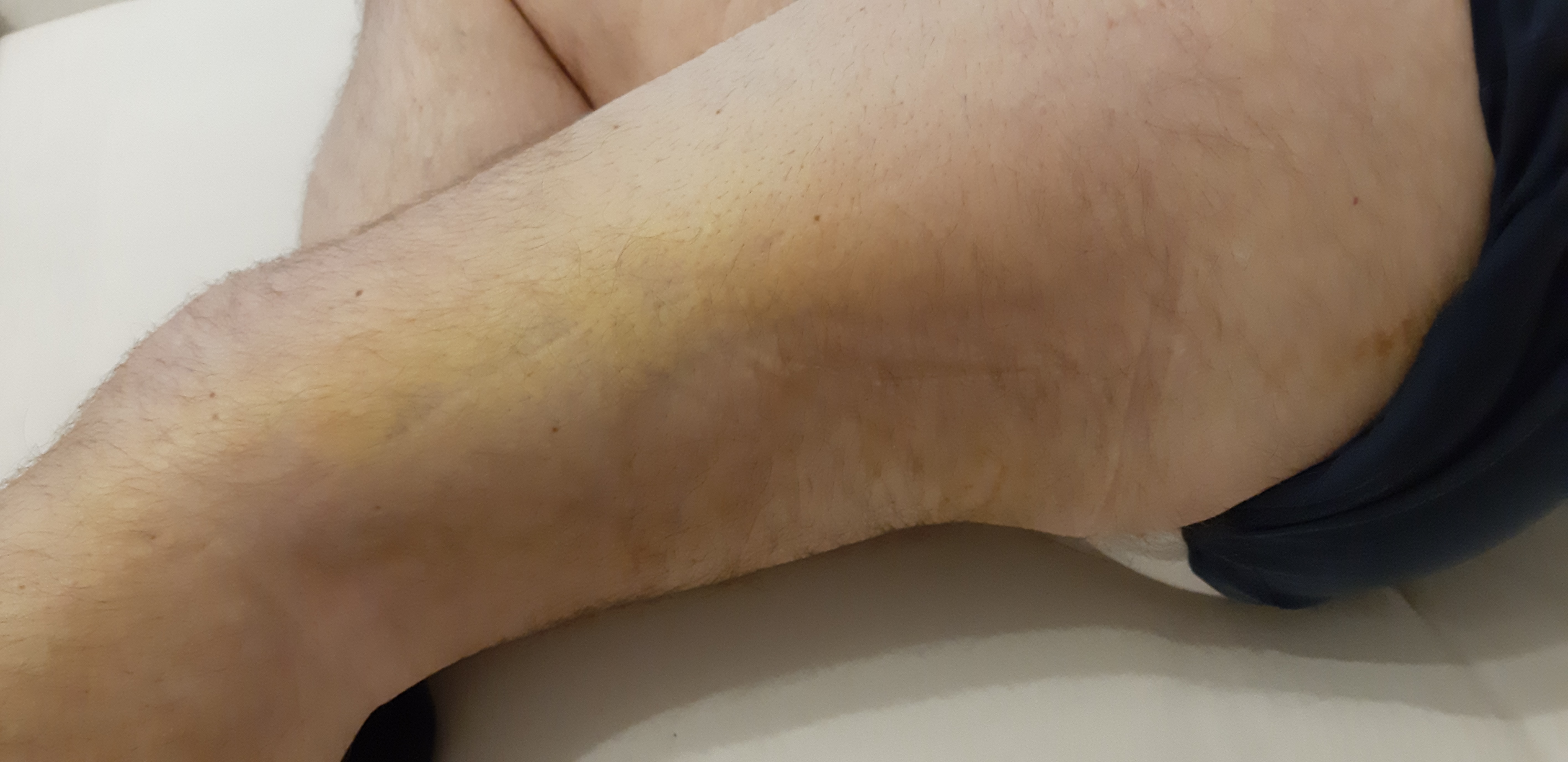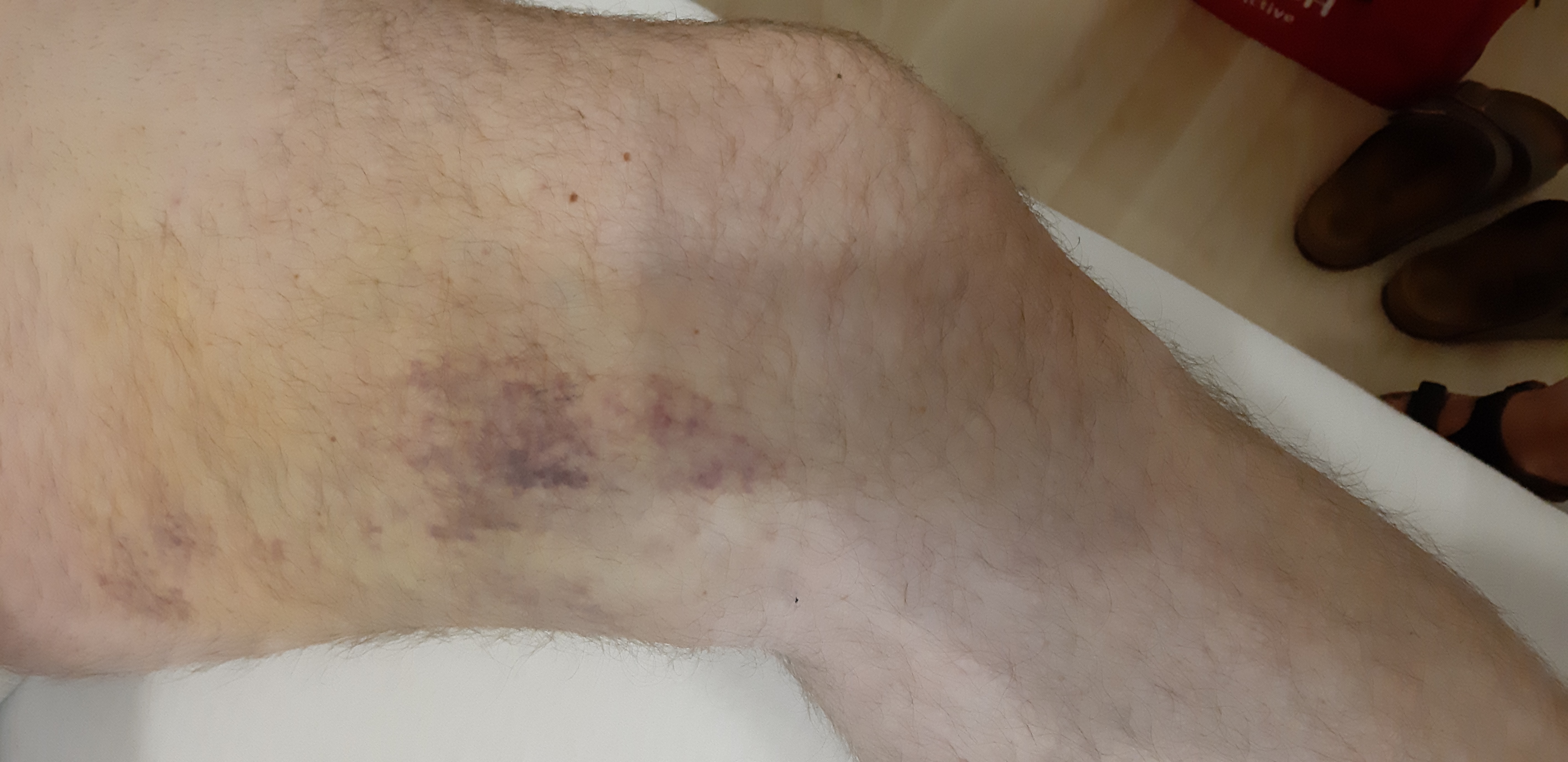 Am dritten Tag der Anwendung konnte der weitere Abbau des Hämatoms lateral (außen) und medial (innen), sogar bis in die Knieregion, festgestellt werden.