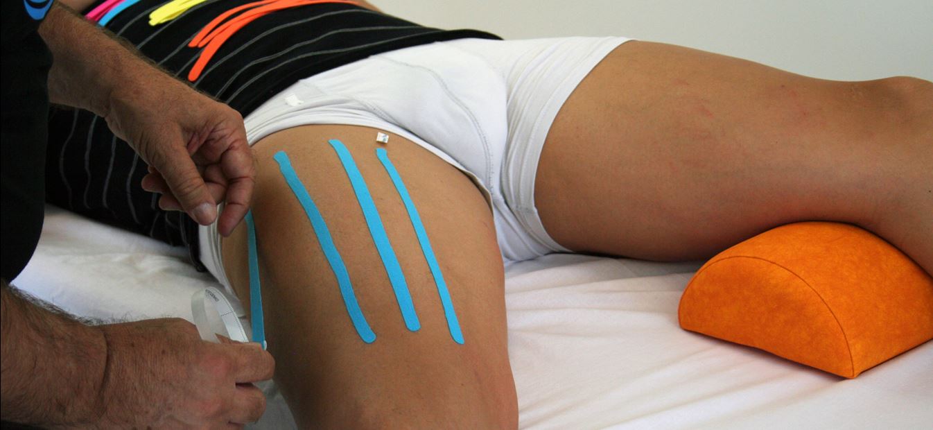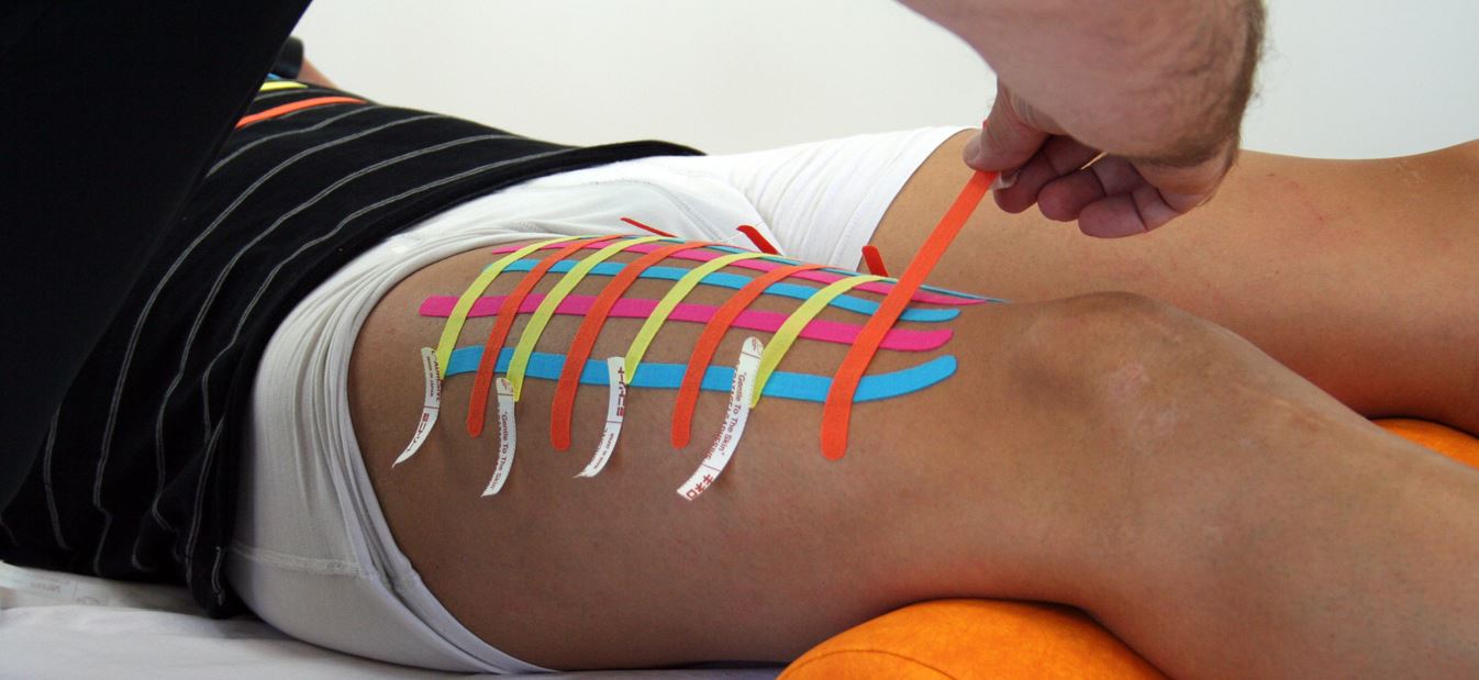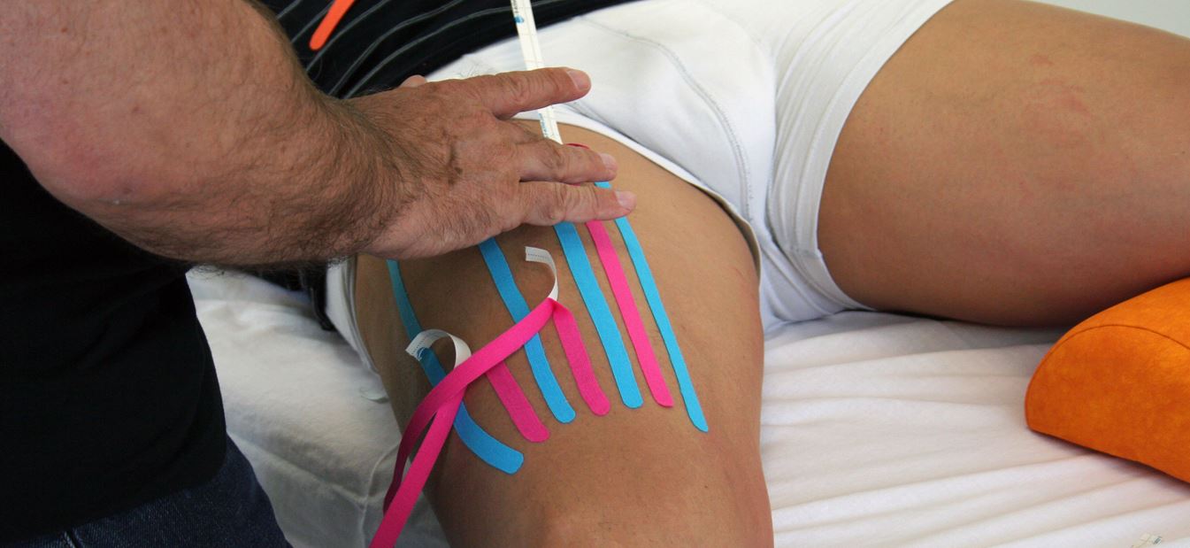 Die Basis eines solchen Streifens wird, in unserem Beispiel bei einer Oberschenkelverletzung, in Neutralposition in Richtung Körper angelegt. Das zu beklebende Körperareal wird anschließend so weit wie möglich vorgedehnt und der Streifen darauf ohne Zug angelegt. Mit etwas Abstand zum ersten werden auch die restlichen Streifen mit der gleichen Technik appliziert.