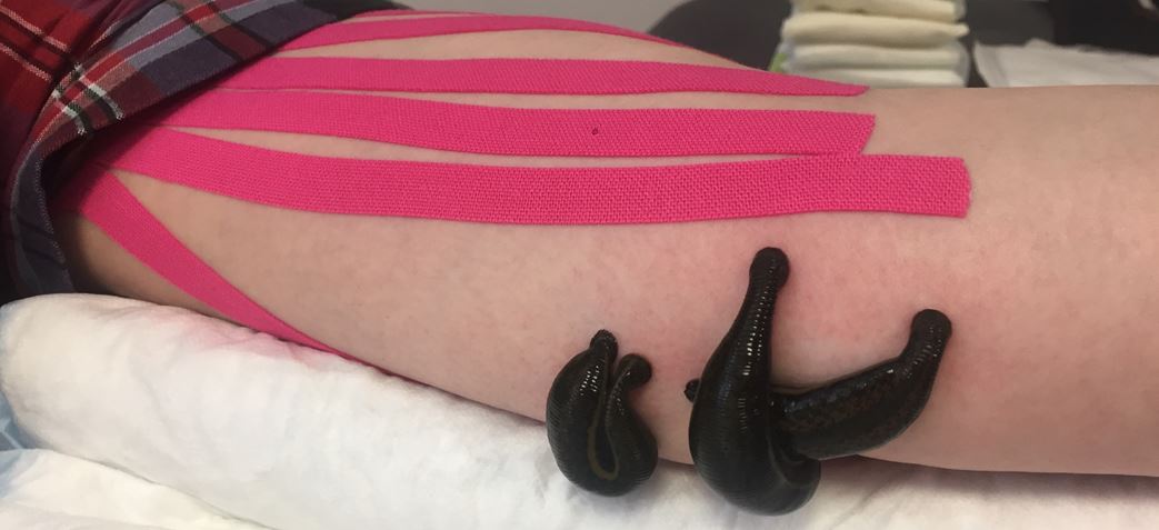 Die Patientin wurde von mir in der Naturheilpraxis mit Manueller Therapie, Lasertherapie und Injektionen (Procain, Traumeel, Art. Cubiti D5 als Mischinjektion) und anschließendem K-Active Taping behandelt. Nach fünf Sitzungen VAS 3. Dann entschloss sich die Patientin zu der von mir geratenen Blutegeltherapie in Verbindung mit Kinesiologischem Taping. Es erfolgte die Anlage von drei Egeln an den betroffenen Stellen sowie sofortige Anlage eines K-Active Tapes mit Basis in der Region der Achselhöhle mit Verlauf des Fächers hauptsächlich in Richtung Ellenbogenbeuge. Es wurde ein ausreichender Abstand zu den Bisswunden gelassen, um einer Infektionsgefahr vorzubeugen. Dauer der Behandlung: ca. zwei Stunden. Danach wird ein Wundverband angelegt, das Tape wird belassen. Wiedervorstellung am nächsten Tag. Patientin gibt VAS 1-2 an. Bei einem zweiten Kontrolltermin zwei Wochen später ist die Patientin komplett schmerzfrei.
