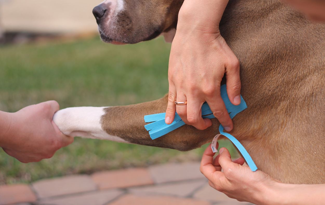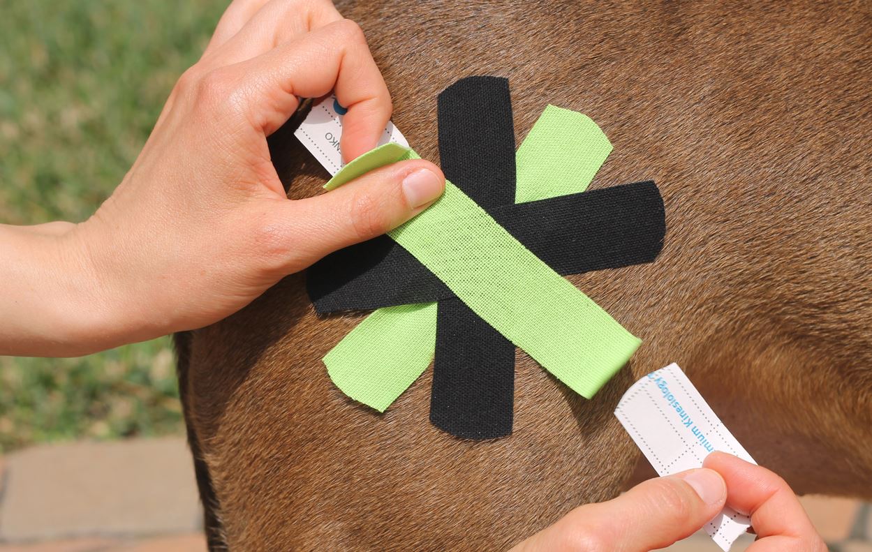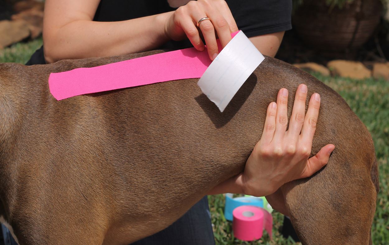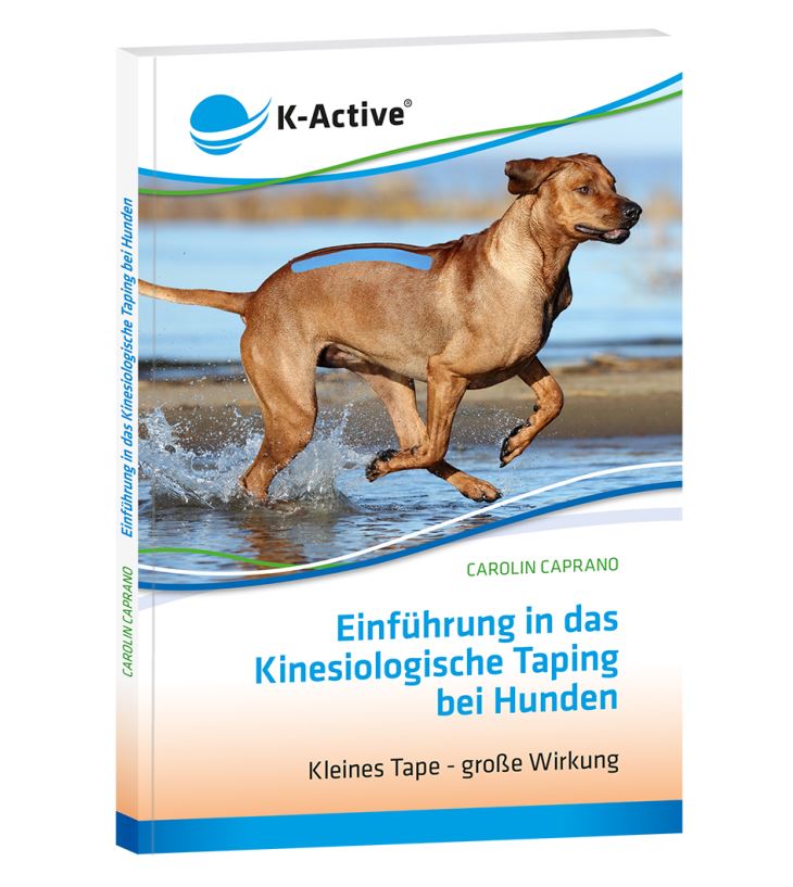 Hunde können in der gleichen Weise wie der Mensch von der Wirkung des Kinesiologischen Tapes profitieren. Auf relativ kurzem und glattem Fell haftet das Tape wie auf der menschlichen Haut. Es hebt die Haare und damit auch die darunterliegende sanft Haut an. Das Tape beeinflusst in erster Linie die Haut, die Muskulatur sowie die neuronalen und energetischen Systeme. Das Ziel einer Tape-Anlage ist vor allem, die körpereigenen Heilungsprozesse zu unterstützen. Das K-Active Tape verbleibt zwischen einem und sieben Tagen am Hund und steht symbolisch für die Hand des Therapeuten. Diese ist nun in Form des Tapes bis zum nächsten Behandlungstermin therapeutisch wirksam.