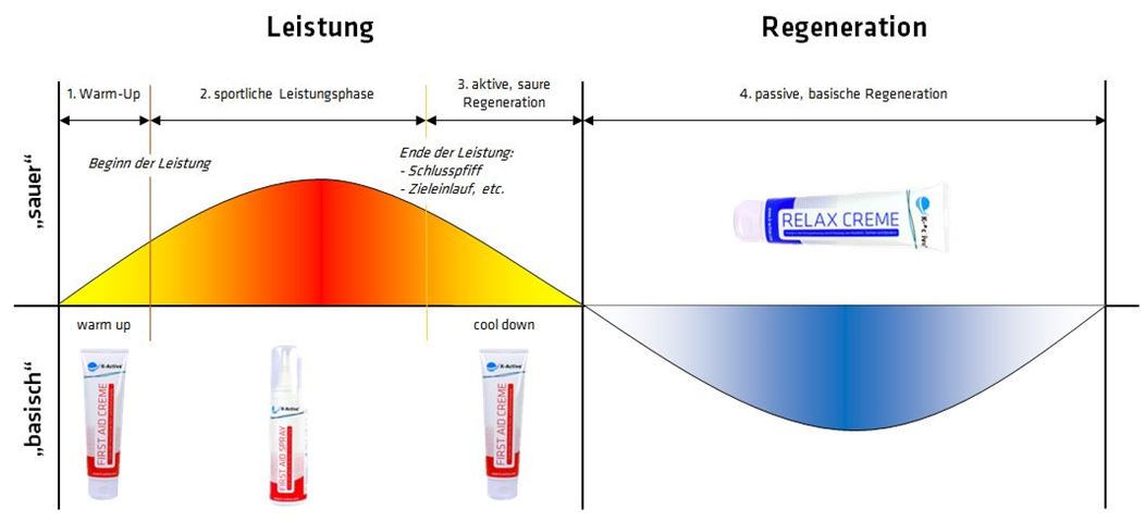 Um dem Körper dabei zu helfen, positive Belastungsreize in höhere Leistungen umzuwandeln, muss man die körperinternen Abläufe ganz genau kennen und sie entsprechend unterstützen. Daher bietet man dem Körper in der Belastungsphase „saure“ Spuren-elemente an, welche zu einem besseren Sauerstofftransport, zur Enzymbildung und somit zur Leistungssteigerung führen. Diese sogenannten „aktivierten Spurenelemente“ können außerdem die Reinigung des Gewebes während des „Cool Downs“ fördern, was als aktive saure Regenerationsphase bezeichnet wird.