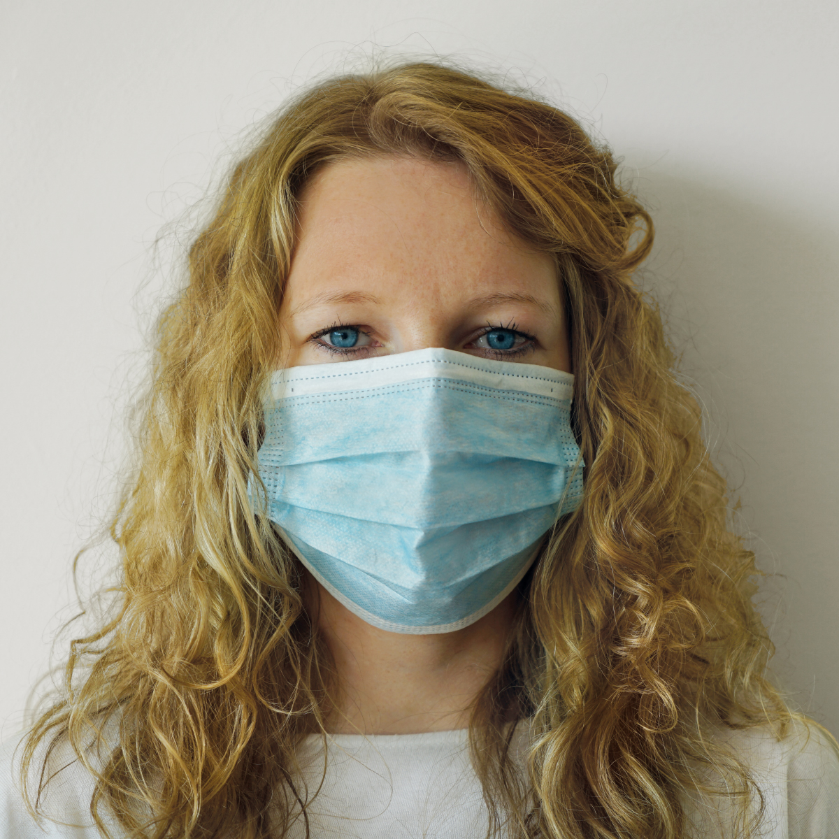 - Einzelnen Mund-Nasenschutz aus der Verpackung nehmen. Die weiße Seite wird den Mund bedecken und die blaue Seite von außen sichtbar sein.