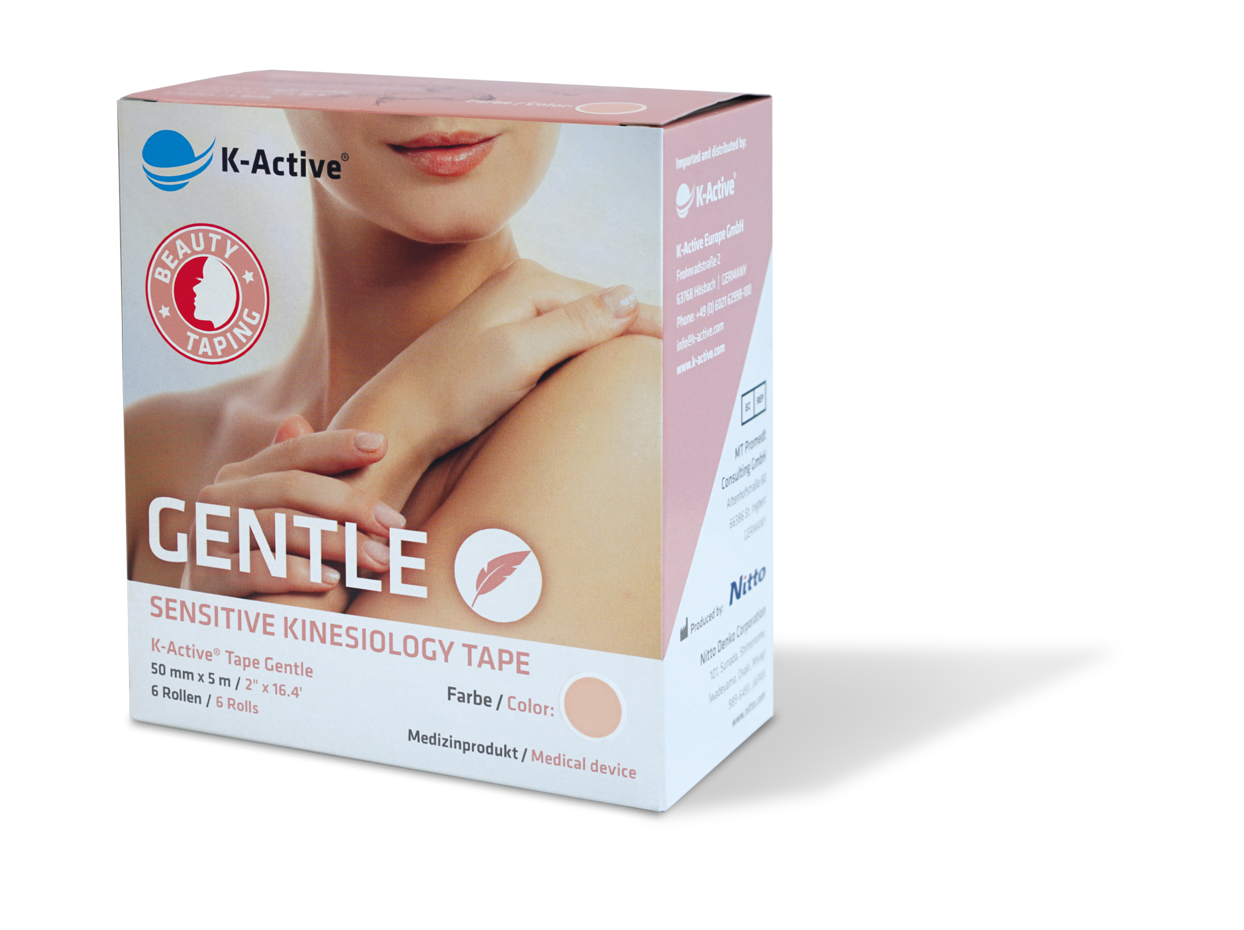 Neues Design – bewährte Qualität! Bei der Verpackung des K-Active® GentleTape gab es einen Tapetenwechsel! Aber keine Sorge: Das Tape selbst ist von dieser Neuerung nicht betroffen. Du erhältst weiterhin dein sanftes und extra-hautfreundliches Tape Gentle, das du kennen und lieben gelernt hast. Gleiches Material, gleiche Farbe, gleiche Sanftheit! Das K-Active® Tape Gentle Unser Extra Sensitive Tape Endlich Schluss mit Hautirritationen Nur das Beste für deine Haut: Das K-Active® Tape Gentle bietet selbst sensibelsten Patienten wie Babys, Kleinkinder und ältere Menschen den besten Schutz. Die besonders hautfreundliche Zusammensetzung des innovativen Stratagel®-Klebers ermöglicht es, sogar Körperstellen mit Narben und Verletzungen zu therapieren. Dementsprechend wird es von Ärzten und Therapeuten vor allem für Patienten mit chronischen Wunden, Krebs- und Diabetespatienten, zur Behandlung von Lymphstau und zum Einsatz nach Operationen empfohlen. Die Besonderheiten unseres hypoallergenen Stratagel®-Klebstoffs Dank des hochinnovativen Stratagel®-Klebers lässt sich das Tape Gentle problemlos von der Haut entfernen und bietet trotzdem besten Halt auf der Haut. Der hypoallergene Klebstoff reduziert Beschädigungen beim Abnehmen des Tapes auf das Minimum und es lösen sich nur sehr vereinzelt Partikel von der Haut. Diese Technologie macht unser Tape so einzigartig und stellt Konkurrenzprodukte in den Schatten. Hochwertigste Materialien für deine Bedürfnisse Das zarte Baumwollgewebe ist zu 100% frei von Latex und Schadstoffen und damit auch für hochsensible Haut geeignet. Durch den akkuraten Kantenschnitt entstehen keine Fadenrisse und unser Tape hält besonders lange. Es liegt federweich auf der Haut und lässt sich durch die hochwertige Fertigung ganz leicht mit einer scharfen Schere zuschneiden, ganz ohne Ausfransen. Der beste Helfer für Face- und Beauty-Taping Bei dieser Taping-Methode werden beispielsweise Tape-Streifen im Bereich der mimischen Muskulatur des Gesichts geklebt. Die Idee dahinter: die Ver- und Entsorgung der Zellen zu verbessern, um somit dem Hautalterungsprozess und Falten entgegenzuwirken. Dank des diskreten Farbdesigns und des angenehmen Tragekomforts ist unser GentleTape genau die richtige Wahl für Anwendungen im Gesicht. Mit Hilfe der richtigen Beauty-Taping-Technik lassen sich außerdem auch Falten am Hals kaschieren oder ein schönes Dekolleté zaubern. Tapen auf die schonendste Art und Weise: Unser GentleTape Das Tape Gentle schmiegt sich der Haut an und gibt sehr sanfte sensorische Impulse. Die höchste dermatologische Qualität unseres Tapes wurde durch zahlreiche Tests bestätigt und ist für uns das oberste Gebot. Gib Reizungen und Hautirritationen keine Chance - setze auf die Produkte und die jahrzehntelange Erfahrung von Nitto Denko! Produktdetails Lieferumfang: 1 Rolle GentleTape, 1 Beipackzettel Maße: 5 cm x 5 m Farbe: hautfarben Material: Baumwolle, Stratagel®-Kleber Unsere K-Active Tapes im Vergleich: