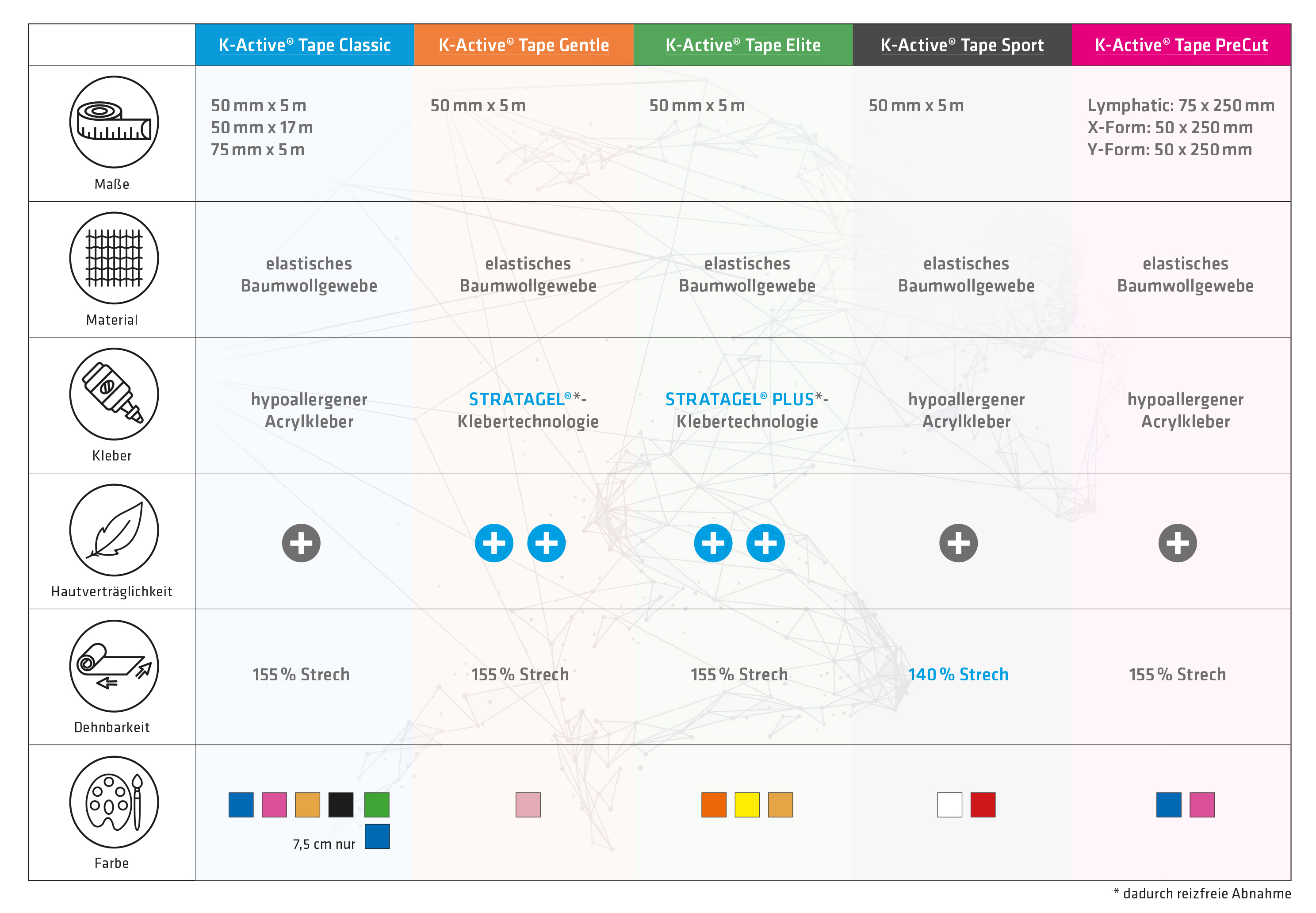 K-Active® Tape Elite Unser Sensitive Strong Tape Deine Anforderungen - unsere Antwort = "Power Gentle" Wer sagt, dass sich stark und sanft ausschließen? Bei K-Active wird die Kombination aus beidem zum smartesten Tape, das es je gab: das K-Active Tape Elite. Durch die Optimierung der STRATAGEL®-Klebertechnologie konnte neben der bewährten Hautverträglichkeit bei diesem Produkt auch die Haftwirkung verstärkt und somit auch die durchschnittliche Anlagedauer verbessert werden. Universell einsetzbar Vor allem Sportler und Patienten mit sensibler Haut werden vom K-Active® Tape Elite überrascht sein: Das Ausnahmetalent unter den Tapes ist sanft zur Haut und trotzdem überragend in der Einflussnahme auf die Körperstrukturen und somit auf die therapeutischen Ergebnisse. Entdecken neue therapeutische Möglichkeiten mit dem vielseitigsten Tape, das es je gab! STRATAGEL® PLUS-Klebertechnologie Speziell entwickelt; verleiht dem K-Active Tape Elite: beste Haftwirkung und lange Anlagedauer bei gleichzeitig schonender Anlage Zuverlässigkeit, selbst bei extremen Herausforderungen, wie zum Beispiel Schwimmen in Salzwasser oder starkem Schwitzen sanfte Tape-Abnahme ohne zusätzliche Hautirritationen Produktdetails Inhalt: 1 Singlerolle Maße: 5 cm x 5 m