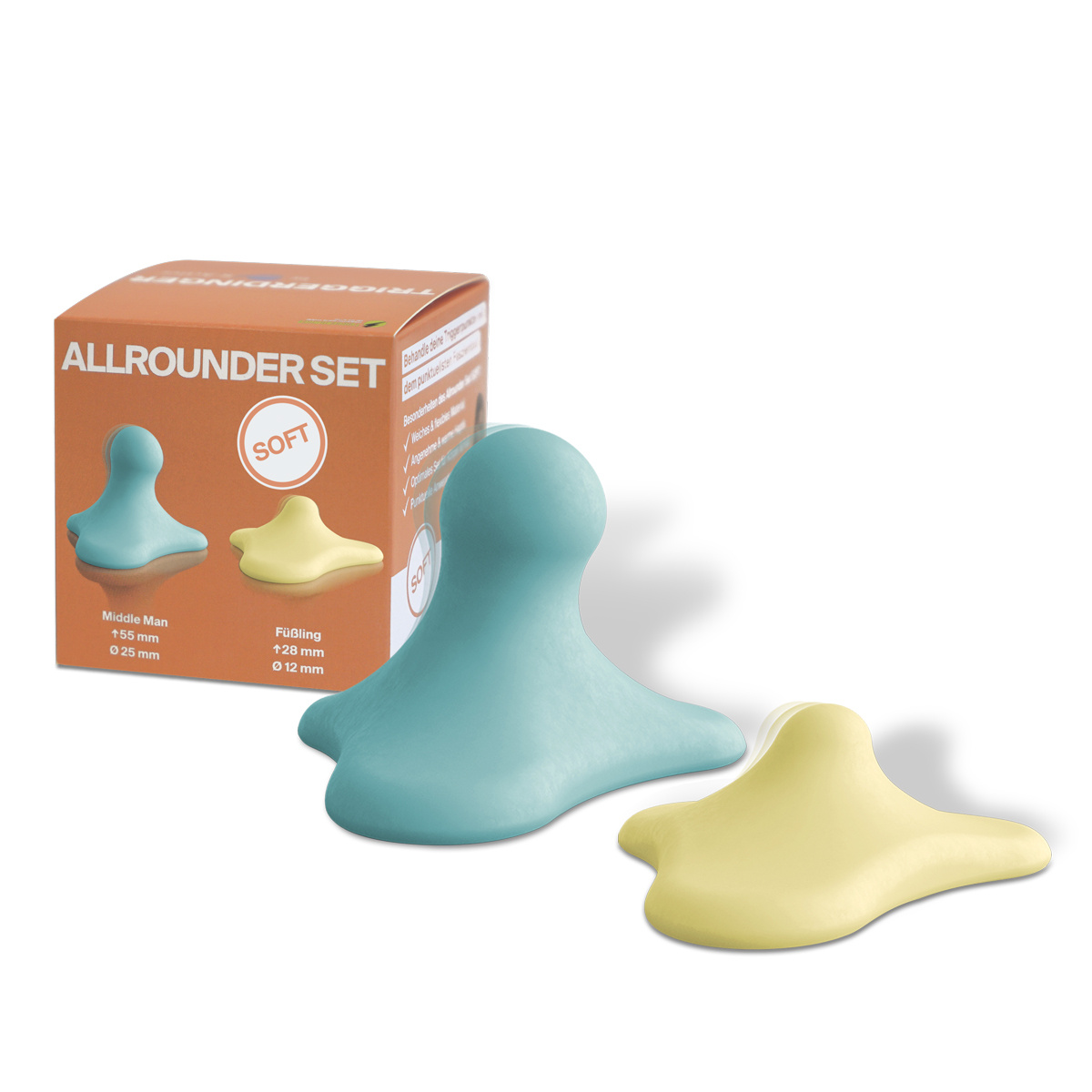 Wenn sich Middle Man und Füßling in einem Set zusammenfinden, bist du für eine komfortable Ganzkörper-Massage bestens ausgestattet! Mit den beiden Triggerdinger SOFT kommst du perfekt an deine Triggerpunkte am Ober- und Unterkörper. Das Allrounder Set SOFT ist die perfekte Kombination für diejenigen, die den ganzen Tag auf den Beinen sind. Und das neue, weiche Material macht die Triggerpunktmassage jetzt zu einem besonders angenehmen Erlebnis.
