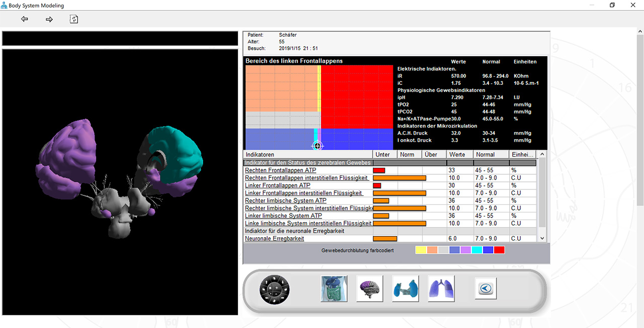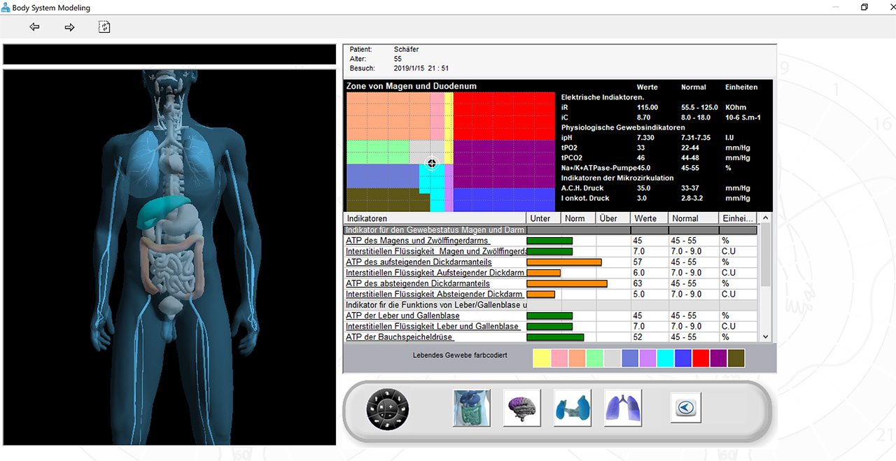 • Die Ergebnisse werden mit repräsentativen Farben, Zahlen und Graphiken aller Organe und Systeme dargestellt.